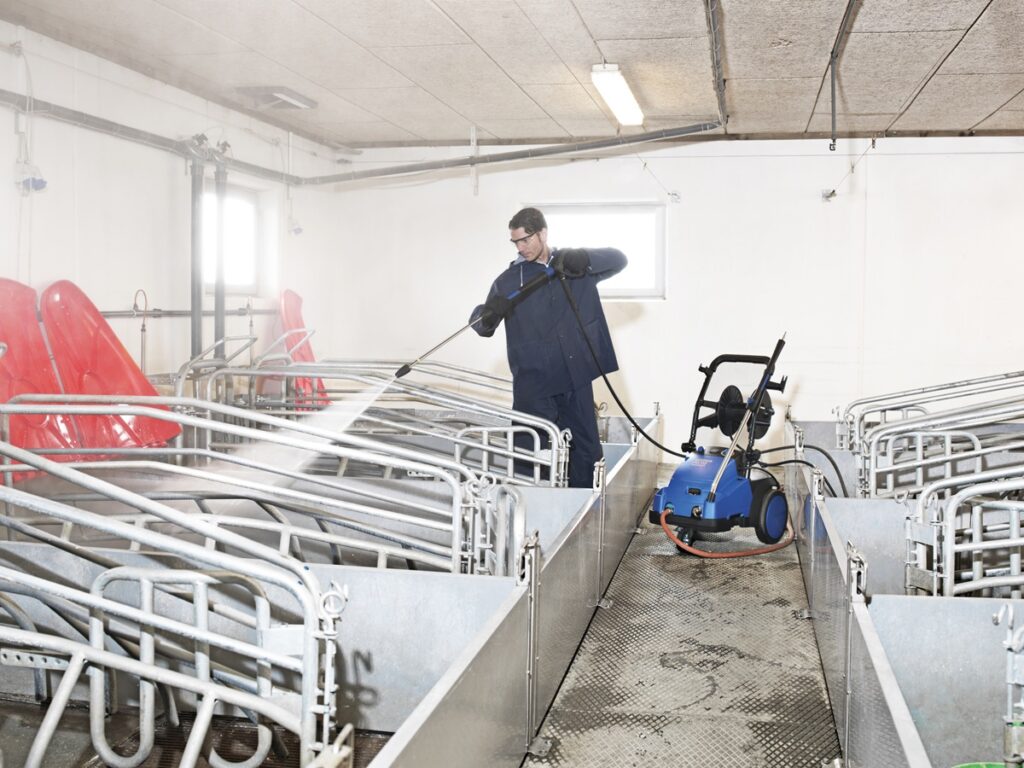 Lavadora de alta pressão com motor trifásico, equipada com motobomba de 4 pistões cerâmicos que aceita água na entrada a 80C.