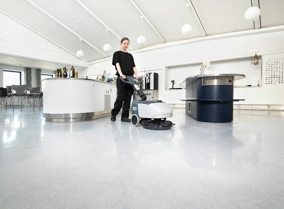 A Lavadora de pisos compacta Nilfisk SC351 permite lavar e secar para trás e para a frente com uma impressionante pressão de escova de 27 Kg associada a maior área de contato com o piso devido ao disco de 380 mm.